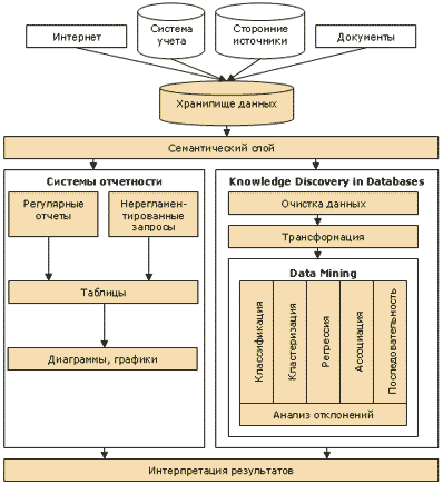Для того чтобы было понятно место и назначение каждого механизма анализа, давайте рассмотрим все это целиком. Будет отталкиваться от того, как человек принимает решения, поскольку объяснить, как рождается мысль, мы не в состоянии, сконцентрируемся на том, как можно в этом процессе использовать информационные технологии. Первый вариант – лицо, принимающее решение (ЛПР), использует компьютер только как средство извлечения данных, а выводы делает уже самостоятельно. Для решения такого рода задач используются системы отчетности, многомерный анализ данных, диаграммы и прочие способы визуализации. Второй вариант: программа не только извлекает данные, но и проводит различного рода предобработку, например, очистку, сглаживание и прочее. А к обработанным таким образом данным применяет математические методы анализа – кластеризацию, классификацию, регрессию и т.д. В этом случае ЛПР получает не сырые, а прошедшие серьезную обработку данные, т.е. человек уже работает с моделями, подготовленными компьютером.