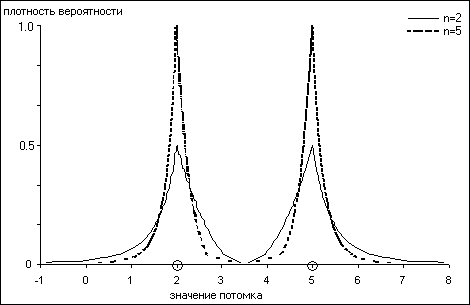 На рисунке приведена геометрическая интерпретация работы SBX кроссовера при скрещивании двух хромосом, соответствующих вещественным числам 2 и 5. Видно, как параметр n влияет на конечный результат: увеличение n влечет за собой увеличение вероятности появления потомка в окрестности родителя и наоборот.