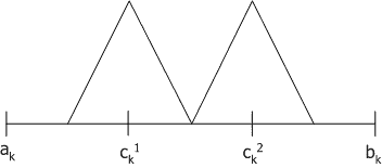 Нечеткий кроссовер (fuzzy recombination, FR-d crossover): создаются два потомка $H_1=(h_1^1,\dots ,h_n^1), H_2=(h_1^1,\dots ,h_n^2)$. Вероятность того, что в $i$-том гене появится число $v_i$ , задается распределением $p(v_i){F(c_k^1), F(c_k^2)}$, где $F(c_k^1), F(c_k^2)$ – распределения вероятностей треугольной формы (треугольные нечеткие функции принадлежности) со следующими свойствами ($c_k^1\Leftarrow c_k^2$ и $I=\mid c_k^1- c_k^2 \mid$):